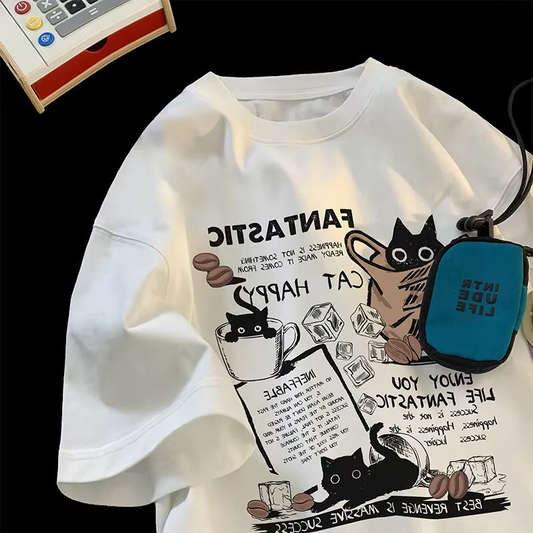 Cute Happy Cat Oversized Summer Graphic Tee for Women
